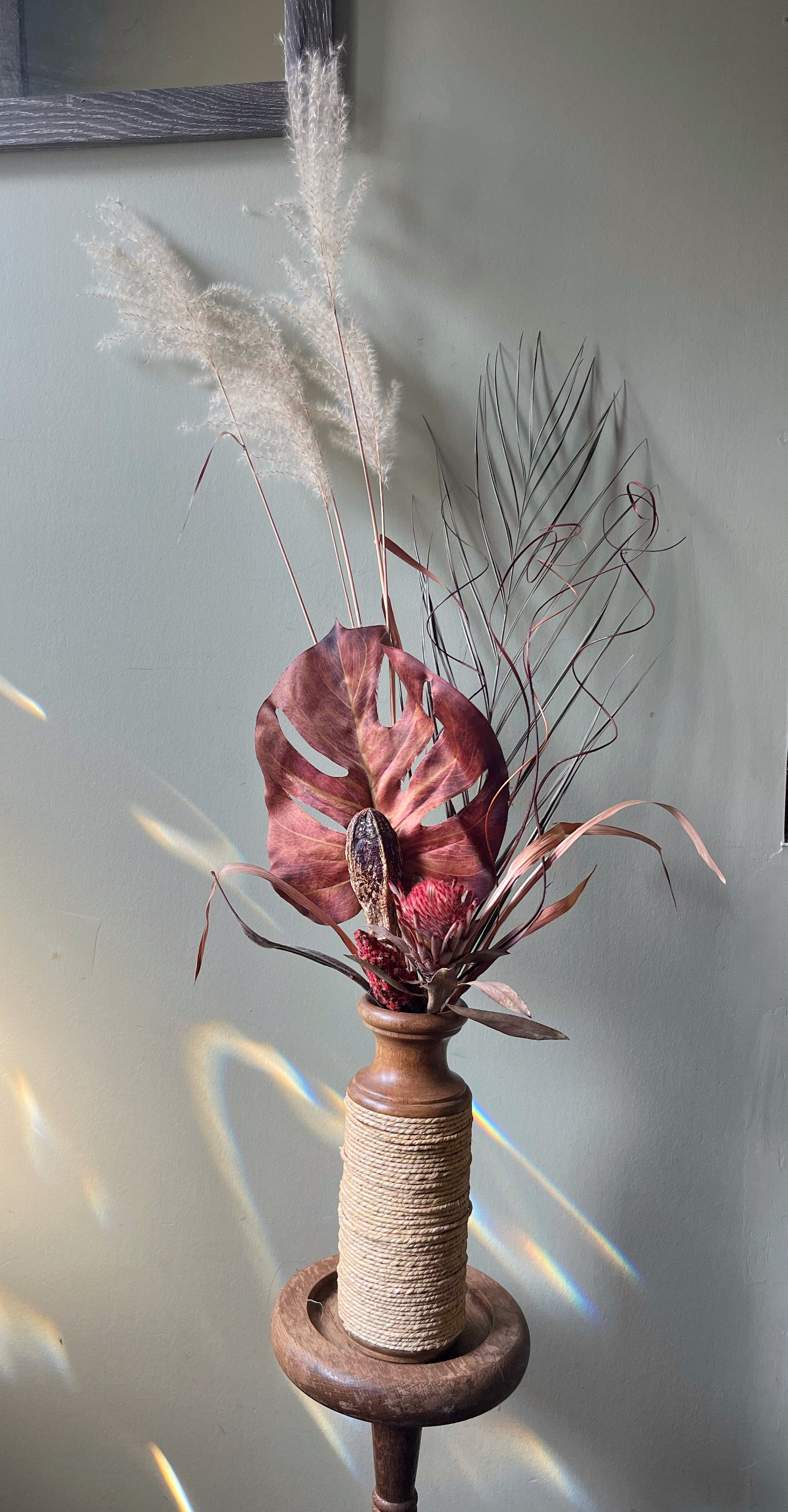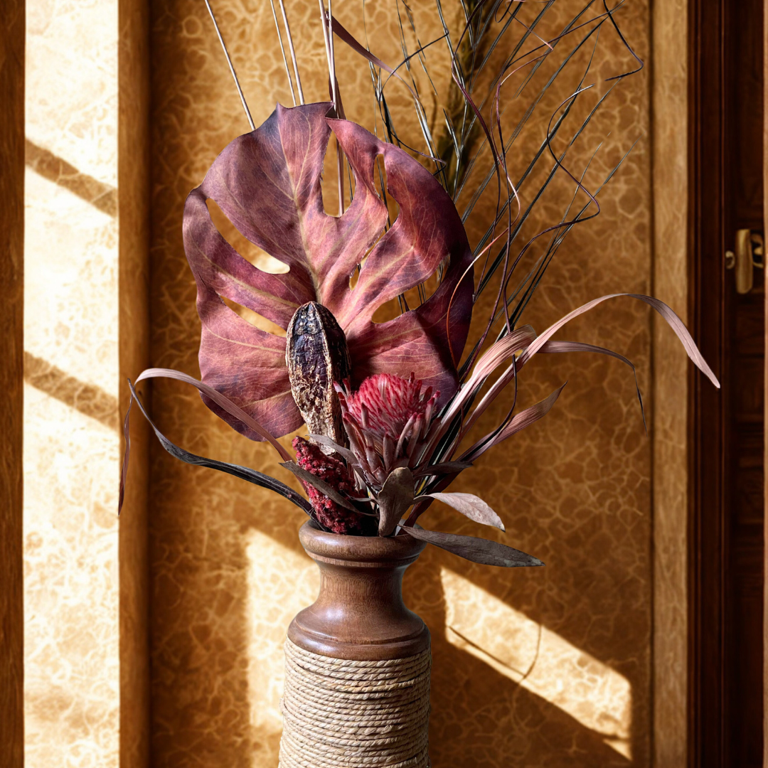 Featuring a sculptural silk monstera leaf, textured seed pod, crimson protea, wispy pampas, and fine curly twigs. It stands tall in a hand crafted wooden vase wrapped in natural rope. perfect for adding a sophisticated organic statement to any space.