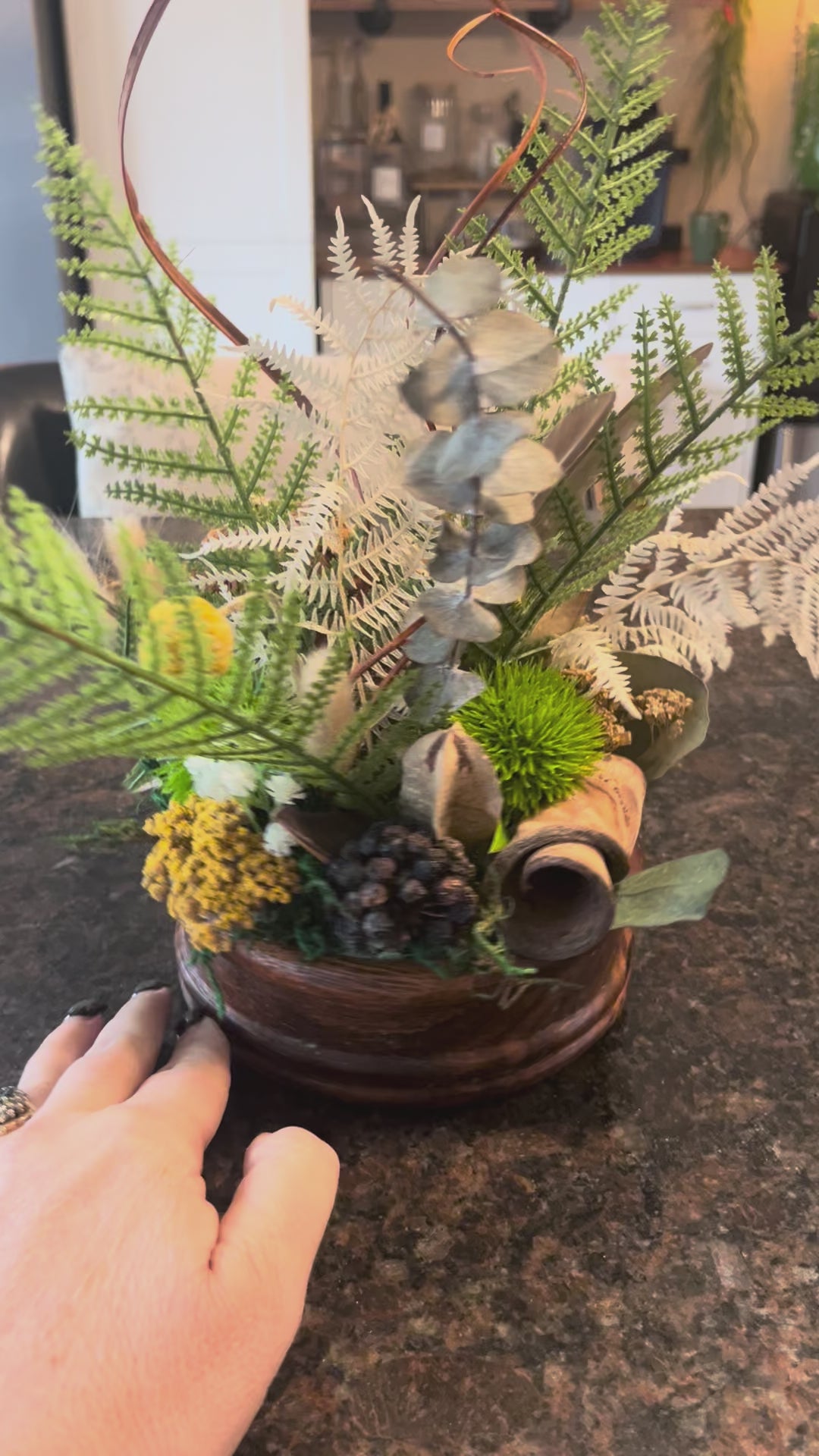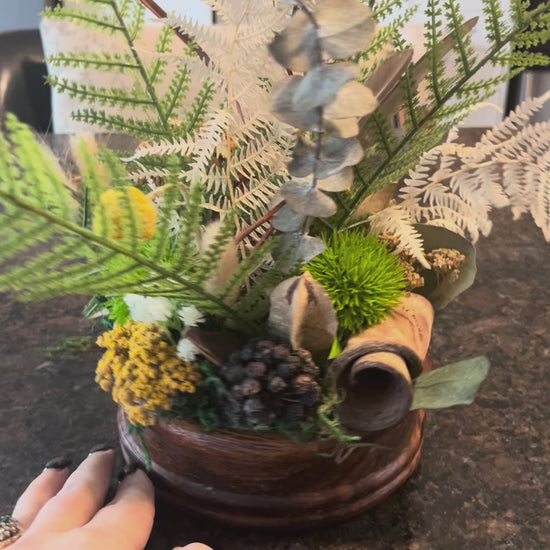 Bring a little forest magic indoors with this low, textural centrepiece designed in a warm wood bowl. Real bleached ferns, preserved eucalyptus, hydrangea, seed pods and grasses are layered with a lotus pod, feather and other woodland-inspired botanicals. Soft mossy greens, creamy whites and warm ochres are paired with a few high-quality faux details (green ferns, mushroom and Kermit blooms) for extra texture and longevity.