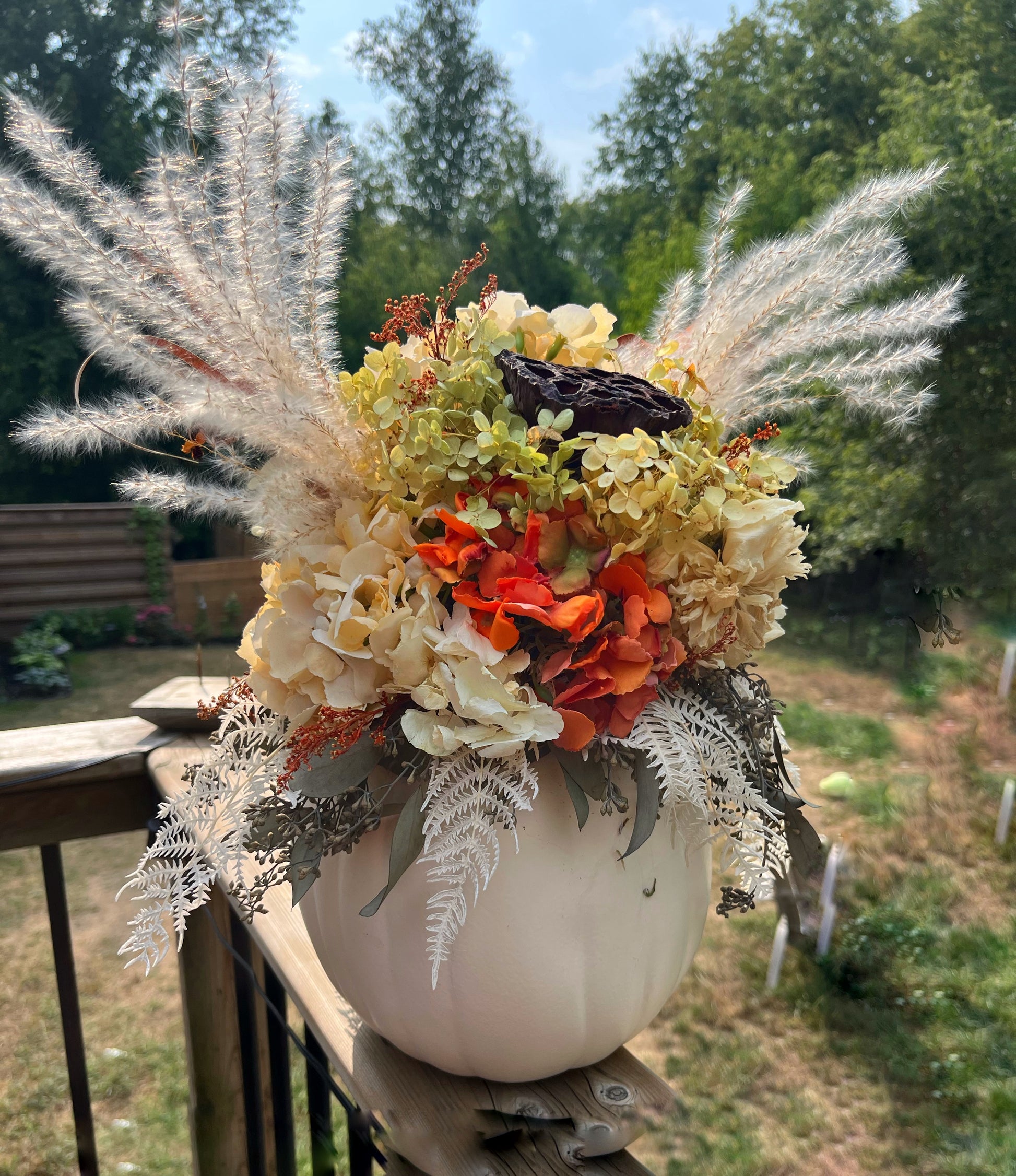 Nestled in a white pumpkin vessel with a natural airy touch. Perfect for seasonal décor that lasts year after year.
