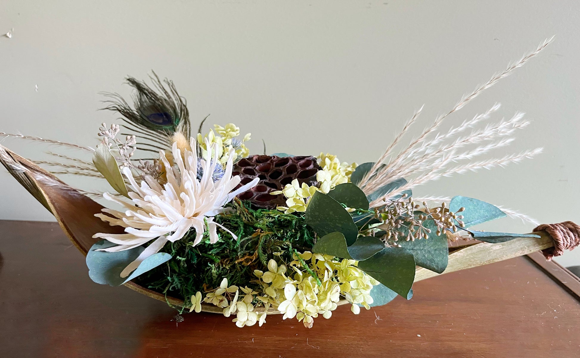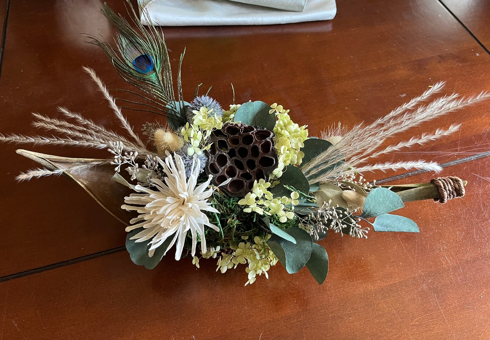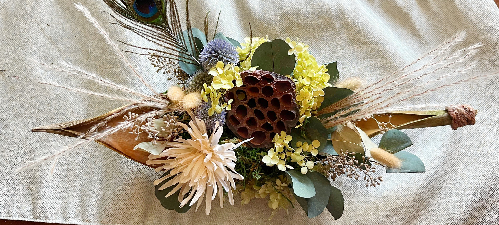 Bring organic elegance to your table with Peacock Drift a one-of-a-kind everlasting centrepiece. Styled in a natural boat shaped leaf base, this piece features a striking lotus pod at its heart, accented with pampas grass, preserved hydrangea, eucalyptus, bunny tails, blue thistle, and a single peacock feather for a touch of luxe artistry.